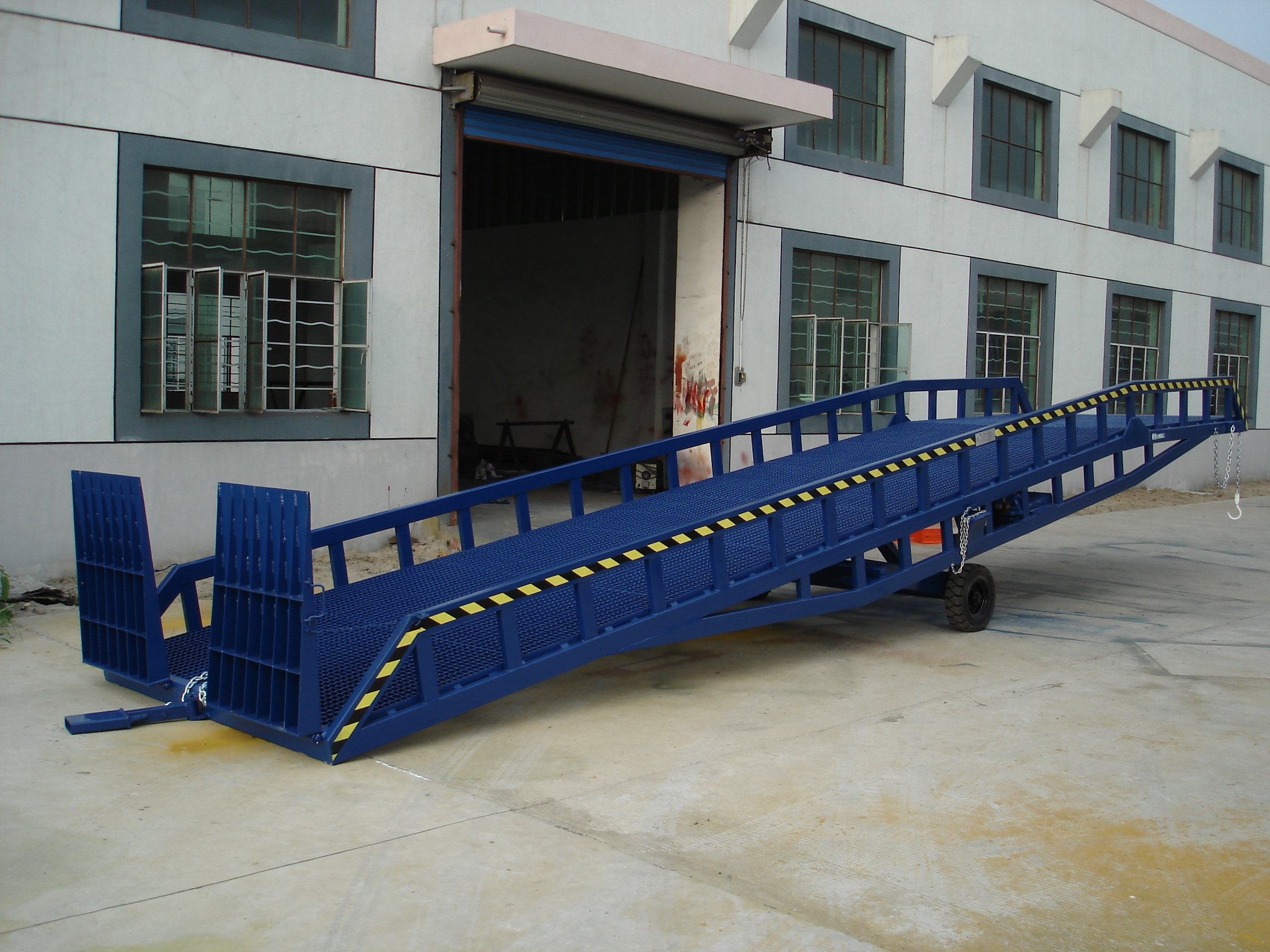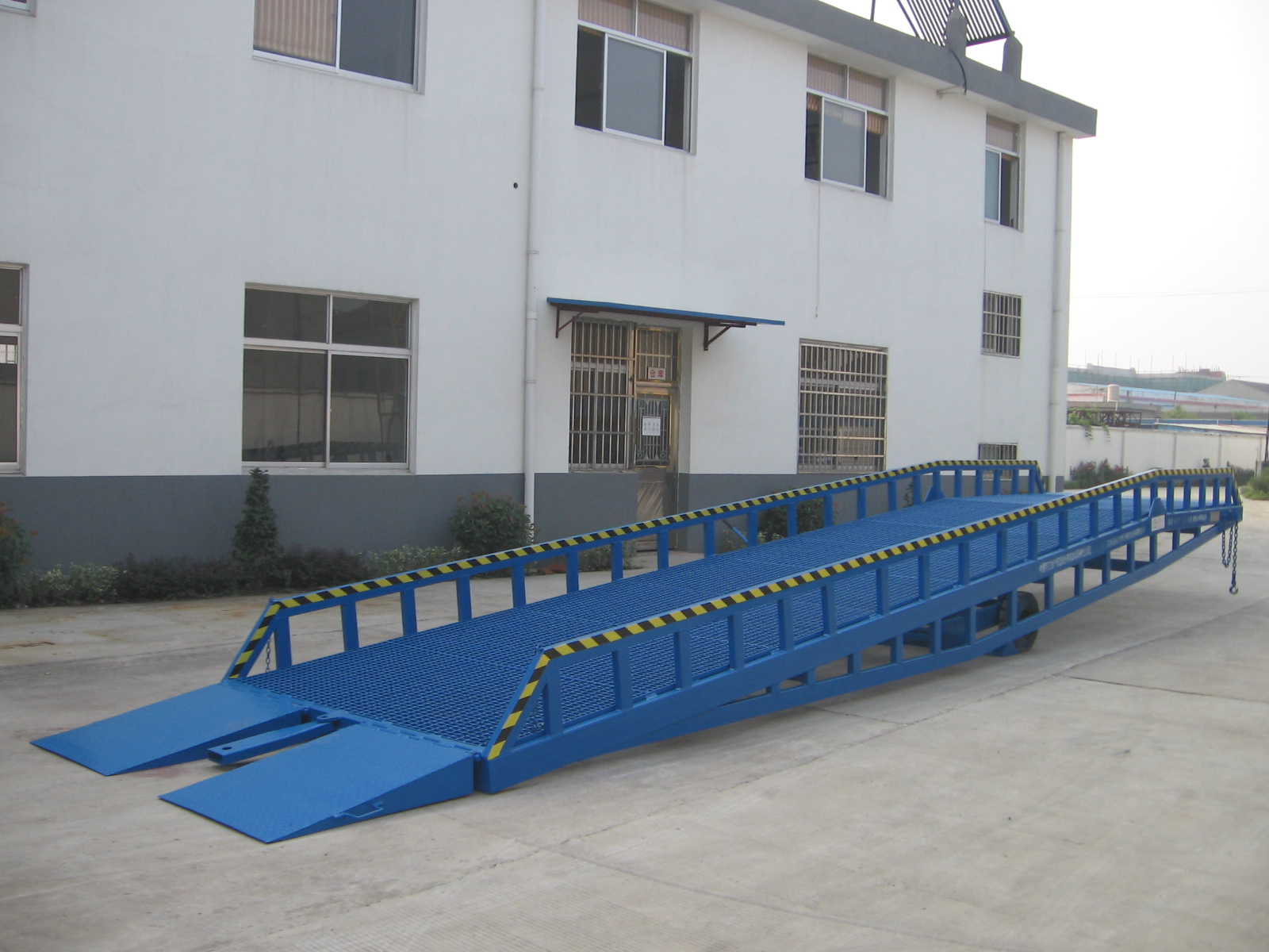 移動式液壓登車橋是與叉車配合使用的貨物裝 卸專用輔助設(shè)備。有了它,叉車能直接從地面駛?cè)肫囓噹麅?nèi)部進(jìn)行 批量裝卸作業(yè)。